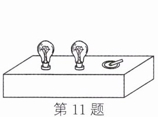 11. 如图所示为一个封闭的电路盒,盒面上有两个灯泡和一个开关。拨动开关,两个灯泡一齐亮或一齐灭。为判断两灯的连接方式,将其中一个灯泡拧下来,发现另一个灯泡依然亮,由此判断:两灯的连接方式是______(串联/并联),判断依据是______。
