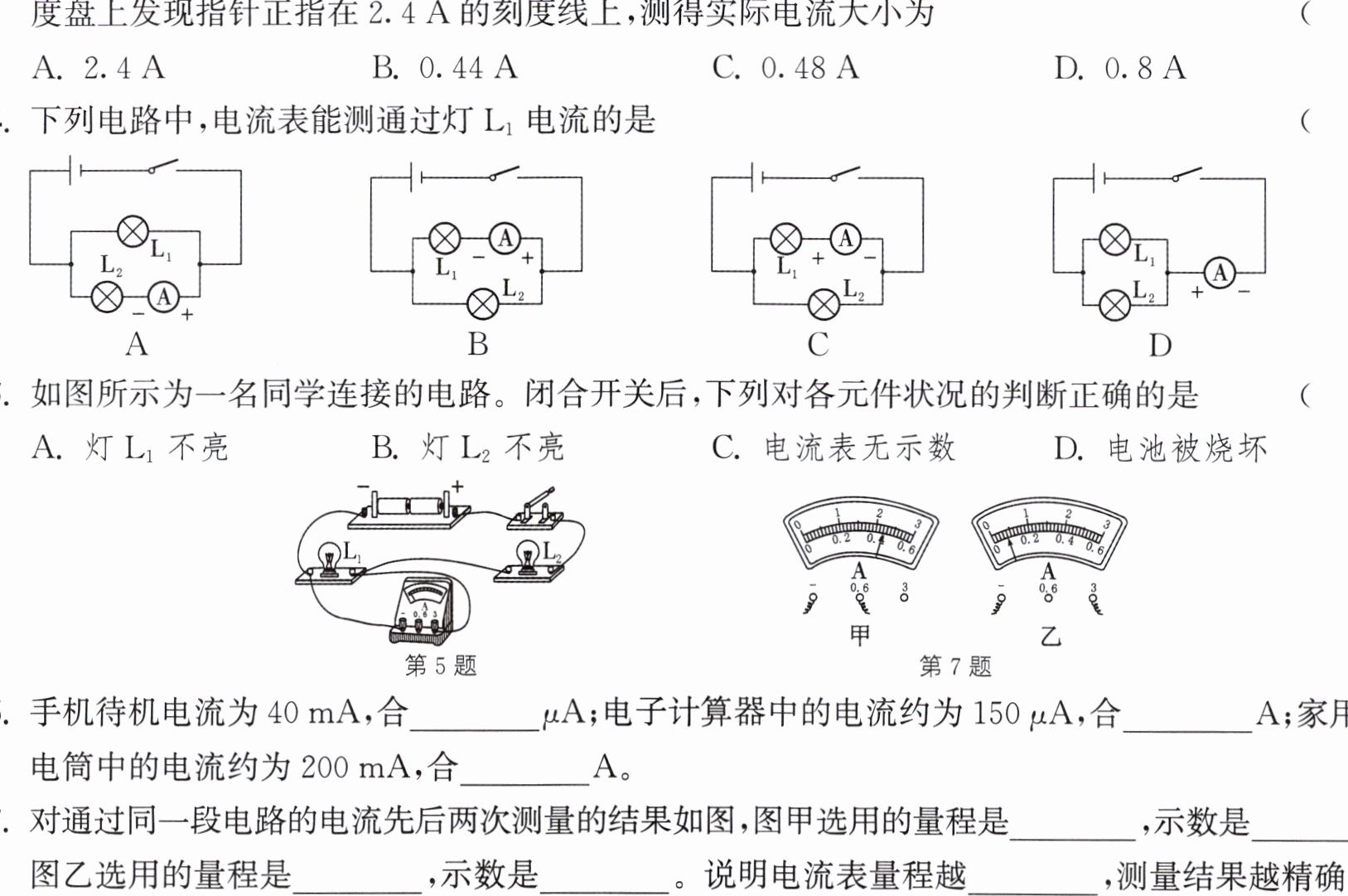 7. 对通过同一段电路的电流先后两次测量的结果如图,图甲选用的量程是______,示数是______;图乙选用的量程是______,示数是______。说明电流表量程越______,测量结果越精确。