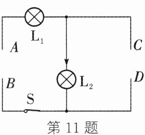 11. 如图所示,根据电路图中所标出的电流方向,在图中的AB和CD间分别填上一个电池或一个电流表的符号(标出电流表的正、负接线柱)。要求:①使电路中实际的电流方向和图中所标出的方向一致;②符合电流表的使用要求。