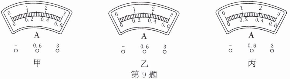 9. 图中甲、乙、丙三只电流表的示数分别是0.24A、0.3A和1.7A,请把三只电流表测量时所使用的量程及指针位置表示出来。