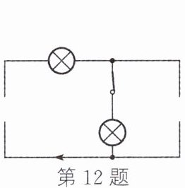 12. 如图所示为一个不完整的电路图,其中箭头所指的方向表示电路接通时的电流方向,请在图中两个空缺的位置分别补画电源或电压表的符号,使之成为一个完整的串联电路。