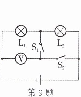 9. 在如图的电路中,开关 $ S_{1} $ 和开关 $ S_{2} $ 原来是断开的,如果将开关 $ S_{1} $ 闭合,$ S_{2} $ 断开,那么电压表测量的是______两端的电压,如果将开关 $ S_{2} $ 闭合,$ S_{1} $ 断开,那么电压表测量的是______两端的电压。