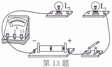 13. 如图所示的实物电路中,有两根导线尚未连接,用笔画线代替导线将电路连接完整。要求:两灯串联,电压表只测灯 $ L_{2} $ 两端的电压,导线不能交叉,考虑电压表量程的选择。