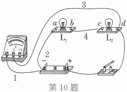 10. 如图所示,电压表测量的是______两端的电压。若要使电压表测量灯 $ L_{1} $ 两端的电压,则只需要将导线______(1/2/3/4)的右端改接到______(a/b)接线柱上即可。