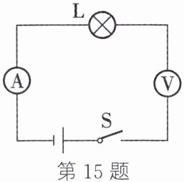 15. 如图所示的电路中,电源由两节新干电池串联组成,各个元件均能正常工作。当开关 S 闭合后,灯______(能/不能)发光,电流表______(有/没有)示数,电压表______(有/没有)示数。