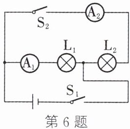 D. 闭合$S_{1}$、$S_{2}$时,$L_{1}$、$L_{2}$串联,电流表$A_{1}$、$A_{2}$示数相等