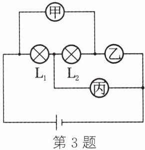 3. 如图所示,若电路中的两只小灯泡$L_{1}和L_{2}$串联,则乙是______表;若两只小灯泡并联,则甲是______表,乙是______表,丙是______表。