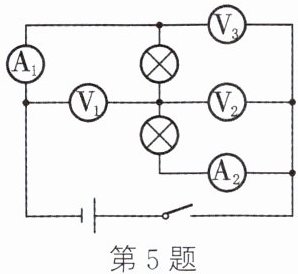 5. 如图所示的电路中,闭合开关,电压表$V_{1}$、$V_{2}和V_{3}的示数分别为U_{1}$、$U_{2}和U_{3}$,电流表$A_{1}和A_{2}的示数分别为I_{1}和I_{2}$,则下列关系正确的是()