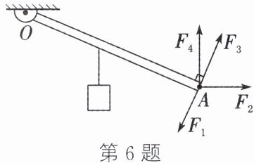 6. 如图所示,在A点分别作用的四个力中,不能使杠杆处于平衡状态的力是____,能使杠杆处于平衡状态的最小力是____;若作用力F始终沿水平方向,则将杠杆抬到接近水平位置的过程中,作用力F将____(增大/不变/减小)。
