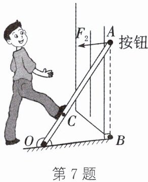 7. 为避免同学们用手按压宿舍楼大门的开门按钮造成交叉感染,小明用轻质木杆自制了“脚踏式杠杆”,借助杠杆按动按钮,如图所示,已知$OB= 60cm、AB= 80cm、OC= 15cm$,当小明在C点用脚给杠杆施加20N的压力$F_{1}$时,按钮触发,大门打开。