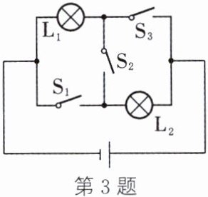 3. 如图所示,只闭合开关______,灯泡$L_1$和$L_2$串联;只闭合开关______,灯泡$L_1$和$L_2$并联;同时闭合开关______,会烧坏电源和导线。