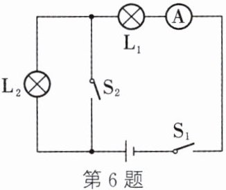 6. 如图所示,当开关$S_1$闭合$,S_2$断开时,电流表A的示数为0.24 A,则通过灯$L_1$的电流是______A,通过灯$L_2$的电流是______A;当$S_1$和$S_2$都闭合时,电流表的示数为0.56 A,则此时通过灯$L_1$的电流为______A,通过灯$L_2$的电流为______A。