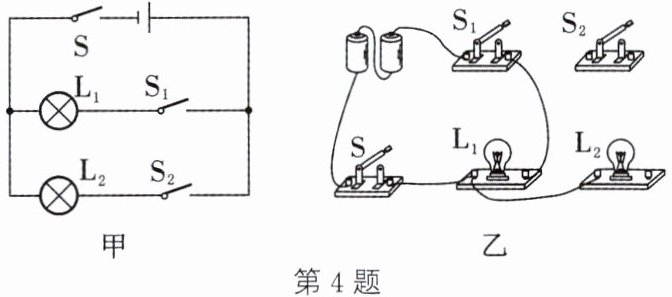 4. 根据如图甲所示的电路图,请你用笔画线代替导线完成图乙中实物的连接。