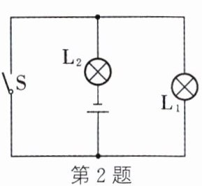 2. 如图所示,两个灯泡始终完好,当开关S断开时,两个灯泡的发光情况是______;当开关S闭合时,两个灯泡的发光情况是______。