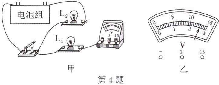 (3)电路连接正确后进行实验,某小组分别测出小灯泡$L_{1}$、$L_{2}$两端的电压和并联电路的总电压,电压表示数相同,如图乙所示,其值为______V。根据这组数据,该小组得出并联电路中电压的规律,你认为实验的疏漏之处是______。纠正后得到并联电路中的电压规律为______。
