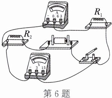 8. 把 5 Ω 的电阻$R_{1}$跟 15 Ω 的电阻$R_{2}$串联起来,接在电压是 6 V 的电源上,通过$R_{1}$的电流是______A,$R_{2}$两端的电压是______V。