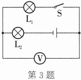 3. 如图所示电路中,电源电压为 3 V,$L_{1}$、$L_{2}$是小灯泡,当开关 S 闭合时,电压表的示数为 2 V,忽略温度对灯丝电阻的影响,则 ()