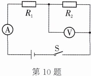 10. (2024·榆林府谷期末)如图所示的电路,电源电压恒定不变,$R_{1}$的阻值为 10 Ω。闭合开关 S,电流表的示数为 0.4 A,电压表的示数为 6 V。求: