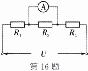 16. 三个定值电阻串联后接在电压恒定的电源两端,其阻值$R_{1}= 5Ω,R_{2}= 10Ω$,$R_{3}= 15Ω$。某同学将一只电流表接在$R_{2}$两端,如图所示,发现其示数为1.5 A,则通过$R_{2}$的电流为______A,电路的总电阻是______Ω。若将电流表的位置改接一只电压表,则电路的总电阻是______Ω,电压表的示数为______V。