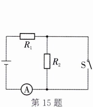 15. 如图,电阻$R_{1}和R_{2}$的阻值分别为 10 Ω 和 20 Ω,电源电压保持 6 V 不变。当开关断开时,电流表的示数为______A;当开关闭合时,$R_{1}$两端的电压为______V。