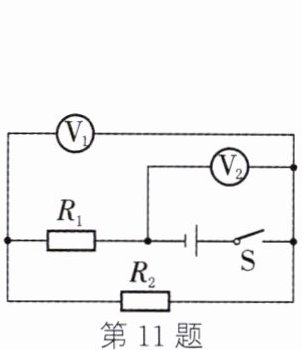 11. (易错题)如图电路中,$R_{1}= 10Ω,R_{2}= 30Ω$。闭合开关 S,电压表$V_{1}与V_{2}$的示数之比是()