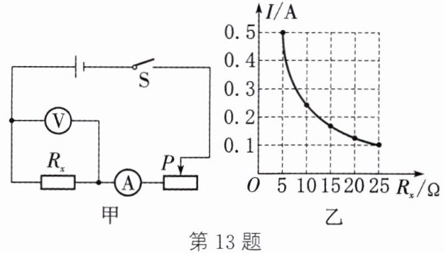 13. (2024·菏泽成武二模)某同学利用如图甲所示的电路进行实验,电源电压恒为 3 V,更换 5 个定值电阻$R_{x}$,得到如图乙所示的图像。以下有关叙述正确的是 ()