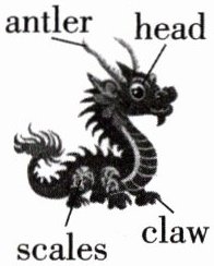 3. ______ These can include the head of a camel, the antlers(角) of a deer, antler head the claws of an eagle, and the scales of a fish! Before the race, the dragon boat has to be “woken up” or made ready to race. In a special ceremony, the dragon's eyes are painted with a dot. Painting the dragon's eyes is said to wake the sleeping dragon. scales claw 4. ______ Each boat usually has 20 paddlers(划桨手) who sit side by side in rows of two. There is also someone at the back to steer(掌舵) the boat, and a drummer at the front who sets the pace.