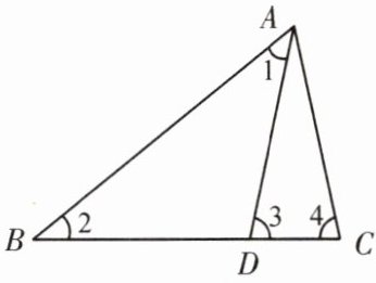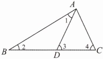 【典例 2】如图,$\triangle ABC$中,$D是BC$上一点,$∠1= ∠2$,$∠3= ∠4$,$∠BAC= 63^{\circ }$,求$∠DAC$的度数。