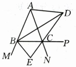 10. 如图, ∠ABC=∠ACB, BD, CD, BE分别平分∠ABC, 外角∠ACP, 外角∠MBC, 以下结论: ①AD//BC; ②DB⊥BE; ③∠BDC+∠ABC=90°; ④∠BAC+2∠BEC=180°; ⑤DB平分∠ADC, 其中正确的结论有(