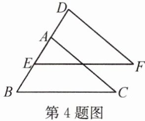 4.如图,$\triangle ABC\cong \triangle DEF$,点$D$,$E在直线AB$上,$BE= 4$,$AE= 1$,则$DE$的长是(