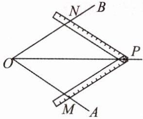 8.(2022·青山)工人师傅常用角尺平分一个任意角,做法如下:如图,$\angle AOB$是一个任意角,在边$OA$,$OB上分别取OM= ON$,移动角尺,使角尺两边相同的刻度分别与点$M$,$N$重合,过角尺顶点$P的射线OP便是\angle AOB$的平分线,请说明理由.