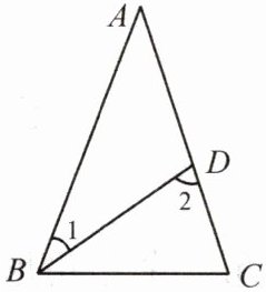 解:$\because BD$平分$\angle ABC,\therefore \angle 1=\angle DBC$,设$\angle A=x$,则$\angle ABC=2x$,$\angle 2=\angle C=2x,\therefore x+2x+2x=180^{\circ },x=36^{\circ },\angle A=36^{\circ }$。