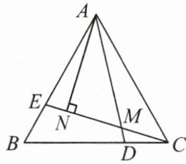 13.如图,在等边$△ABC$中,D,E 分别在 BC,AB 上,连接 AD,CE 交于点 M,$BE= CD.$