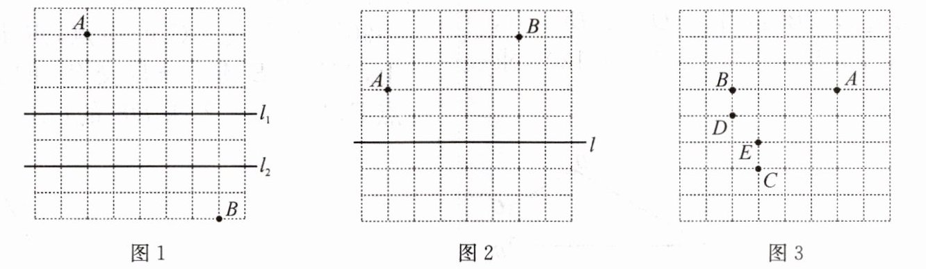 (2)如图2,A,B为格点,M,N在直线l上,$MN= 2$,在l上作点M,N,使$AM+MN+BN$值最小;