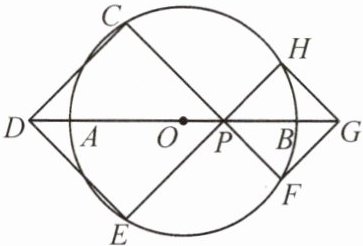 变式.(2024·武昌)如图,点 P 在 $ \odot O $ 的直径 AB 上,作正方形 PCDE 和正方形 PFGH,其中 D,G 两点在 AB 所在直线上,C,E,F,H 四点都在 $ \odot O $ 上,若两个正方形的面积之和为 16,$ OP = \sqrt { 2 } $,则 DG 的长是(