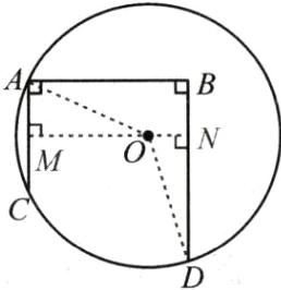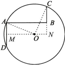 解:过 O 作 $ OM \perp AD $ 于 M,交 CB 的延长线于 N,连接 OA,OC,