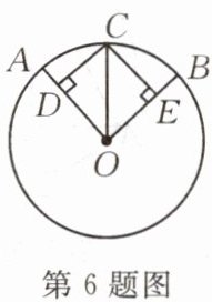 6.如图,D,E分别是$\odot O$的半径OA,OB上的点,$CD⊥OA$,$CE⊥OB$,$CD= CE$,则$\overset{\frown}{AC}与\overset{\frown}{CB}$的大小关系是