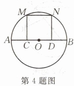 4.如图,在$\odot O$中,C、D分别是OA、OB的中点,$MC⊥AB$,$ND⊥AB$,M、N在$\odot O$上。下列结论:①$MC= ND$;②$\overset{\frown}{AM}= \overset{\frown}{MN}= \overset{\frown}{NB}$;③四边形MCDN是正方形;④$MN= \frac{1}{2}AB$。其中正确的结论是____