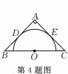 4.如图,等腰直角三角形$ABC$中,$AB= AC= 8$,$O为BC$的中点,以$O为圆心作半圆与AB$,$AC$都相切,切点分别为$D$,$E$,则$\odot O$的半径为(