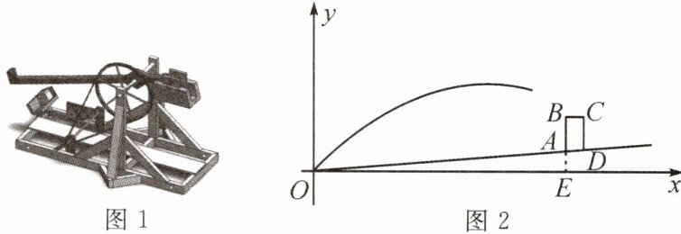变式.如图1所示的某种发石车是古代一种远程攻击的武器.将发石车置于山坡底部O处,以点O为原点,水平方向为x轴方向,建立如图2所示的平面直角坐标系,将发射出去的石块当作一个点看,其飞行路线可以近似看作抛物线$y = a(x - 20)^2 + k$的一部分,山坡OA上有一堵防御墙,其竖直截面为ABCD,墙宽BC = 2米,BC与x轴平行,点B与点O的水平距离为28米,垂直距离为6米.