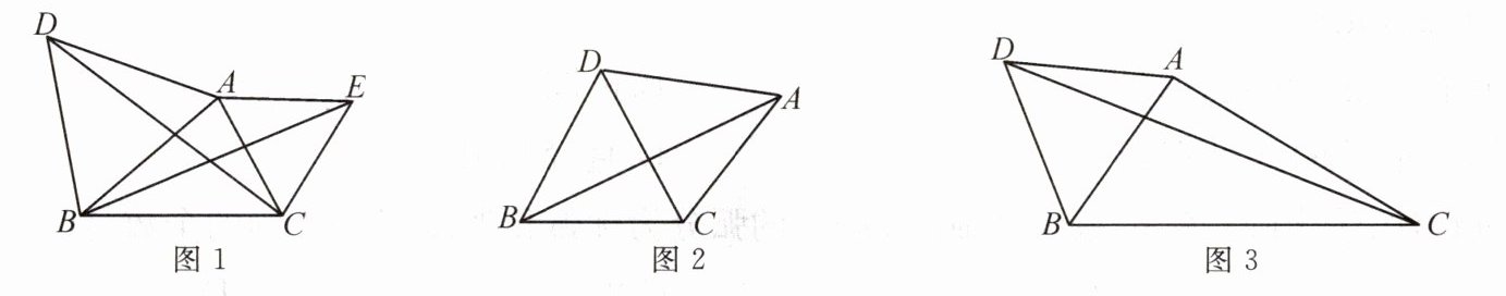 【典例】【证明体验】如图 1,向$\triangle ABC外作等边\triangle ABD和等边\triangle ACE$,连接$BE$,$DC$。求证:$BE = DC$。