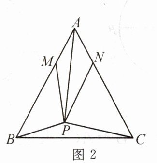 (3)【模型拓展】如图 2,$M$,$N为边AB$,$AC$上动点,且$AM = AN$,在(2)的条件下,求$PM + PN$的最小值;