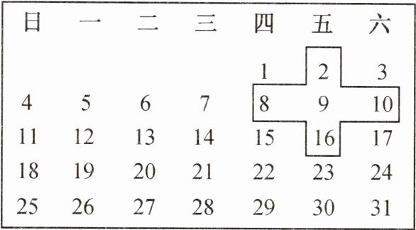 9. 如图,在月历上任意框出 5 个数。如果框出的 5 个数的和是 100,那么框出的 5 个数中最小的数是( )。