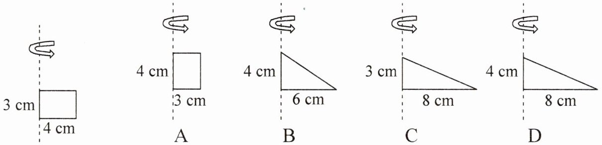 7. 以虚线为轴将图形旋转一周,下面四个图形旋转后形成的几何体与左边的图形旋转后形成的几何体的体积相等的是( )。