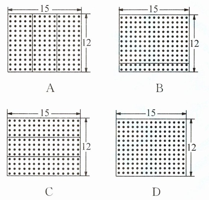 3. 在计算$15×12$时,聪聪使用的方法是$15×4×3$,下面的点子图中,( )能表示这种思路。