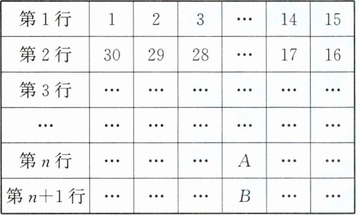 此数表以 30 个数为一个循环,同一循环中同一列の两个数的囷相等,比如第一个循环卍同一列的两个数的和都是31,下一个循环中同一列の两个数の囷比它多60,于是每一个循环中同一列的两个数的和形成了规律,即第a个循环中同一列的两个数的和为$31+60(a-1)=60a-29$。如果n是奇数,那么A和B在同一循环中,$a=\frac{n+1}{2}$,就有$60×\frac{n+1}{2}-29=391$,解得n=13;如果n是偶数,那么B在A的下一个循环的第一行,这时$a=\frac{n}{2}$,A与B的和恰好比第a个循环中同一列的两个数的和多30,$60×\frac{n}{2}-29+30=391$,解得n=13,与n是偶数矛盾,此情况不成立。综上所述,n=13。