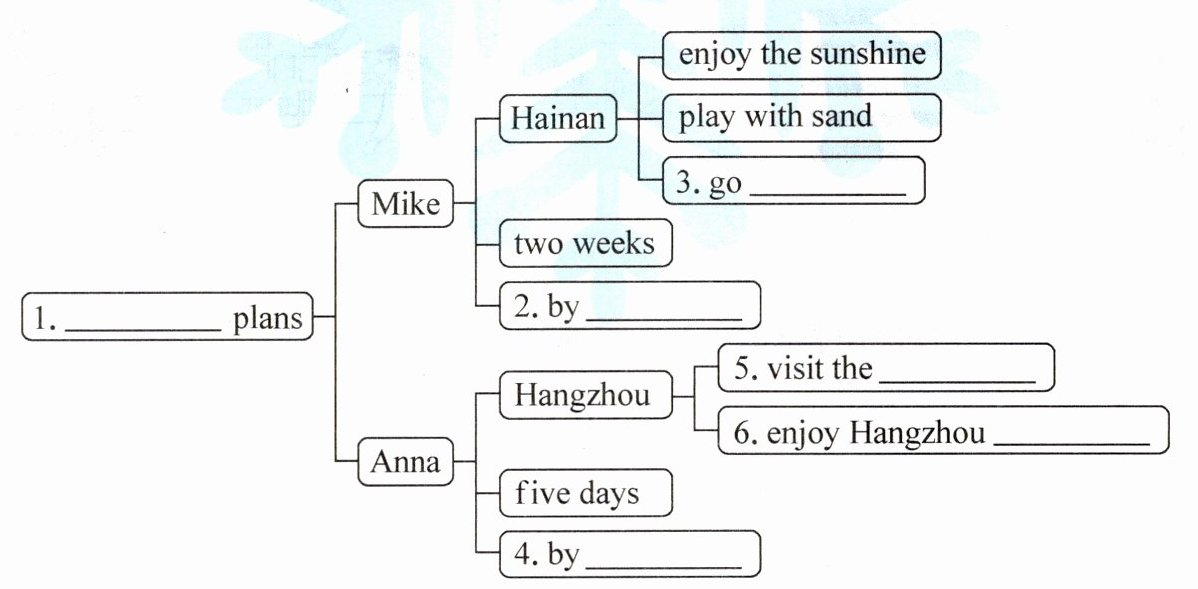 有两位同学分享了他们的假期计划,请听下面两篇短文,完成思维导图。听三遍。