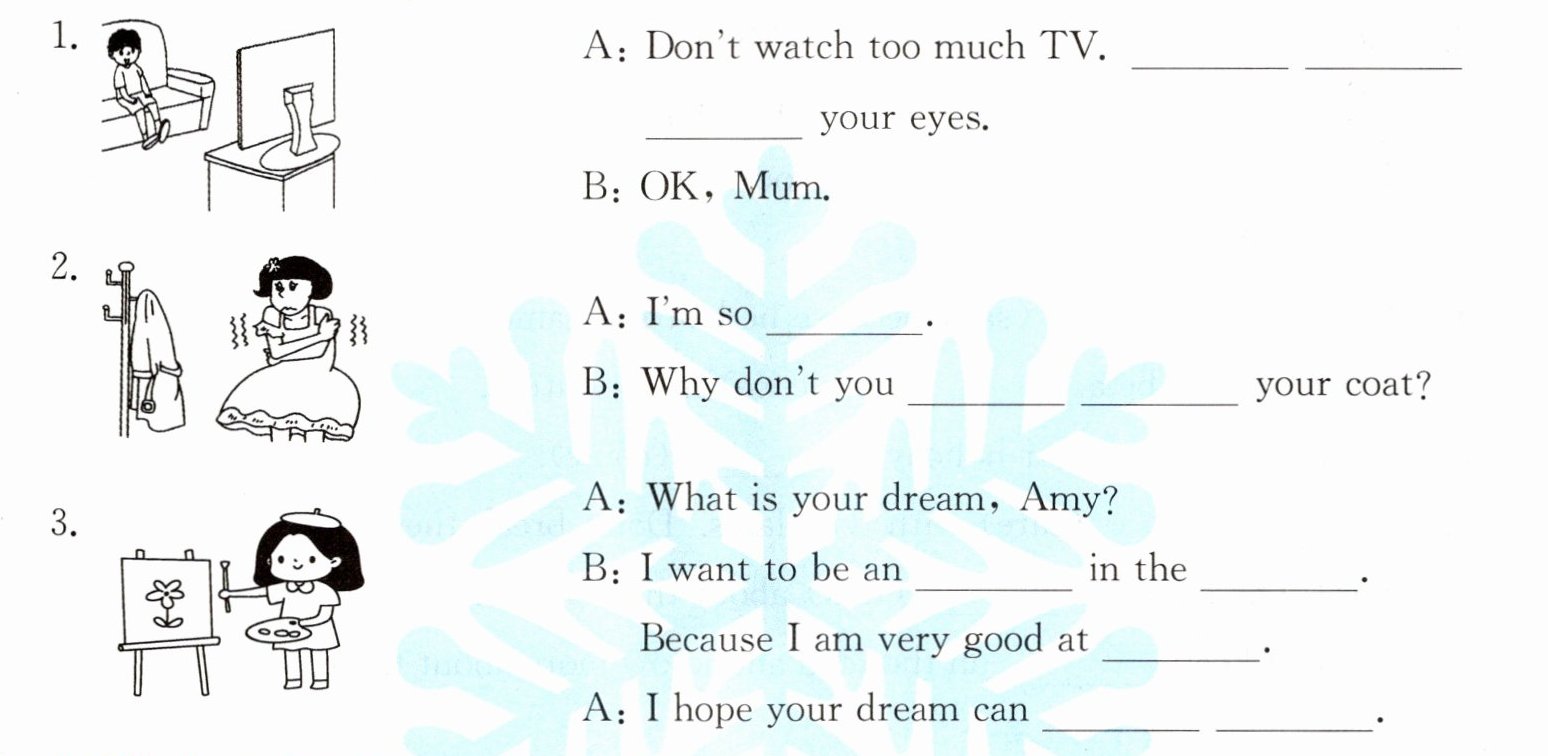 1. It's bad for 2. cold,put on 3. artist,future,painting,come true
