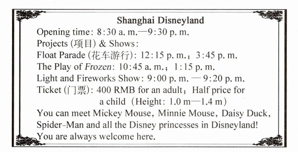)2. What can Molly do in Shanghai Disneyland?A. She can watch the parade. B. She can watch fireworks. C. Both A and B.