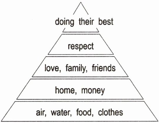 First, humans need things to keep them alive: air, water, food and clothes. Next, humans need to feel safe. They need a home and enough money. Then, humans want love. They want family and friends. They do not want to feel lonely. After that, humans need respect(尊敬). They need to respect themselves and they want other people to respect them too. Finally, humans want to do their best. This brings them the most joy in life.